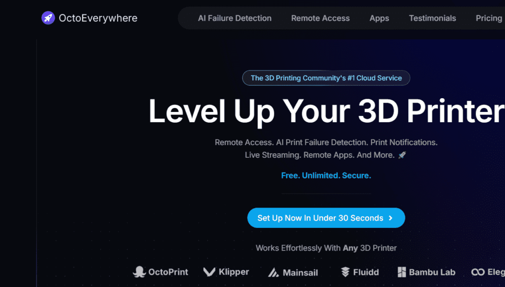 Octoeverywhere AI connects your 3D printer (OctoPrint, Klipper, or Bambu Lab) to the internet safely so you can monitor and control it from anywhere. It provides real-time remote access, notifications, and AI-powered print-failure detection to save time and materials. The platform is based on an AI engine called Gadget that analyses webcam images and printer telemetry to detect failed prints. Octoeverywhere stands out for combining secure access, powerful AI tools, and a multi-printer dashboard into one service. It is ideal for individual makers, educational labs, and even small print farms.