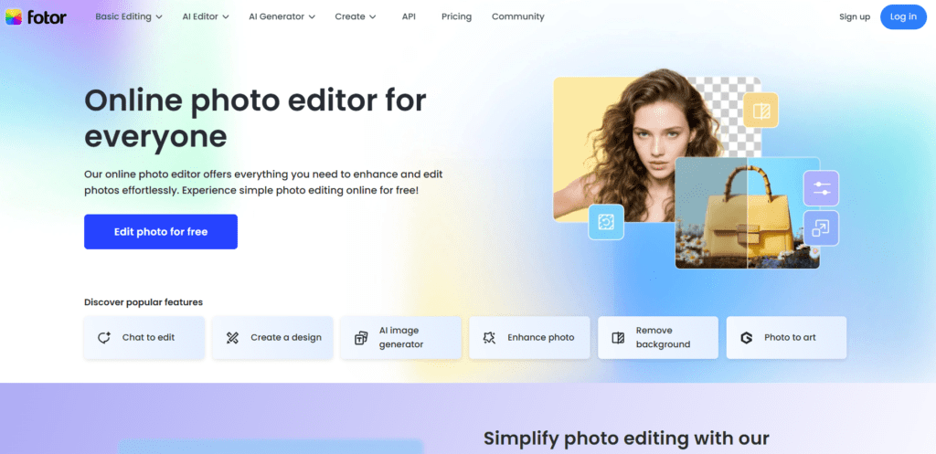 Fotor is an AI-powered photo editing and graphic design platform that allows users to enhance images, generate artwork, and create marketing visuals using intelligent automation tools. The platform combines artificial intelligence with traditional editing features to simplify complex photo-manipulation tasks. Users can generate images from text prompts, automatically remove backgrounds, enhance photos with AI, and apply creative design templates. These features allow creators to transform ordinary photos into professional visuals without advanced design skills. Moreover, it works as a creative AI studio for photographers, designers, marketers, and social media creators. With editing tools, design templates, and AI image generation capabilities in a single platform. Because of its easy interface and automation tools, Fotor has become a solution for AI photo editing, visual content creation, and digital design projects.