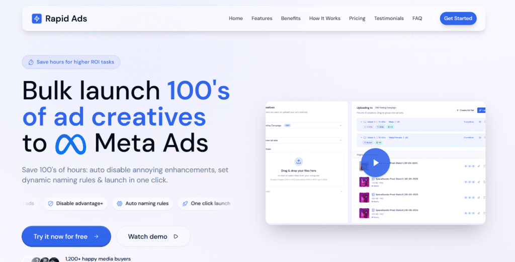 Rapid Ads is an AI-powered bulk Meta Ads automation tool help the advertisers launch hundreds of creatives. It speeds up campaign execution rather than generating ads. The AI majorly relies on automation logic, structured rules, and API integrations.