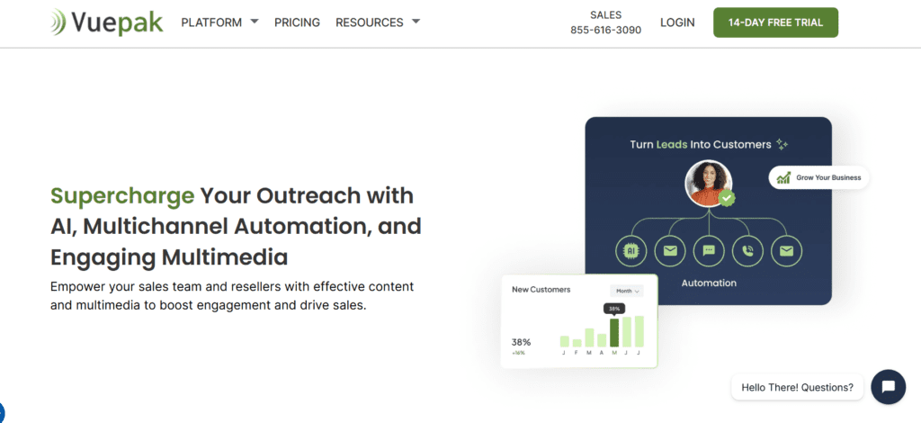 Vuepak AI is a sales and marketing automation platform that centralizes content creation and multimedia campaign management on one dashboard.